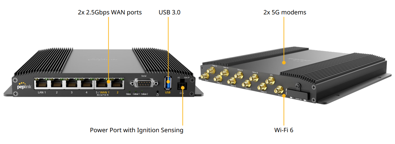 | SIM Options | Nano-SIM (4FF) Peplink eSIM BYO eSIM (2 profiles per modem)6 RemoteSIM from SIM Injector7 FusionSIM |